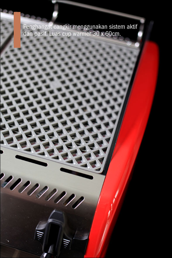 Fasilitas air panas terdapat di sebelah steam wand di bagian kiri, jarang saya gunakan karena cukup menyedot air dari boiler dan membuat cycle time agak lambat karena memberikan waktu kepada boiler untuk mengisi dan memanaskan air kembali.