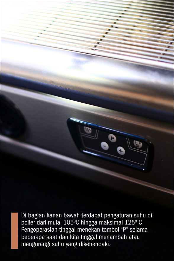 Di tengahnya terdapat switch power yang hanya digerakan ke sebalah kanan sekali saja untuk menyalakan mesin. Terakhir di ujung paling kanan terdapat fasilitas untuk memprogram suhu di boiler dengan menekan tombol “P” selama 3 detik dan mengatur plus minus sesuai dengan suhu yang kita kehendaki.