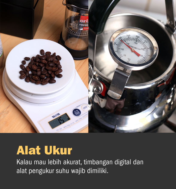 TIPS 4 : Alat ukur seperti timbangan digital dan thermometer digunakan agar terdapat presisi jumlah kopi, volume air, dan suhu yang tepat. Kesemuanya dijual dalam harga yang relatif terjangkau. Wajib dimiliki.