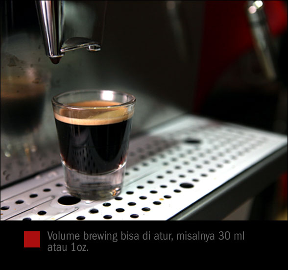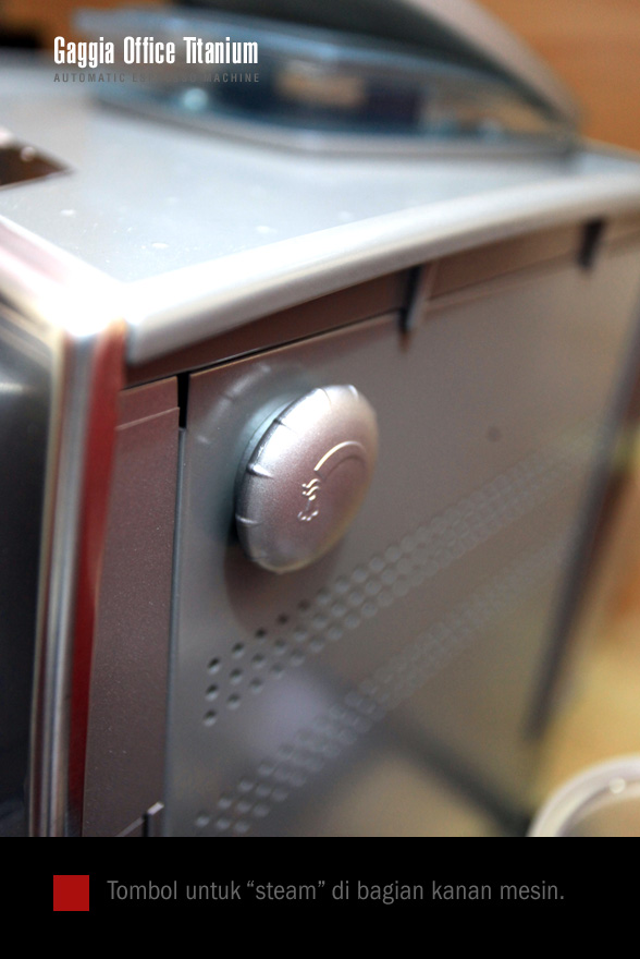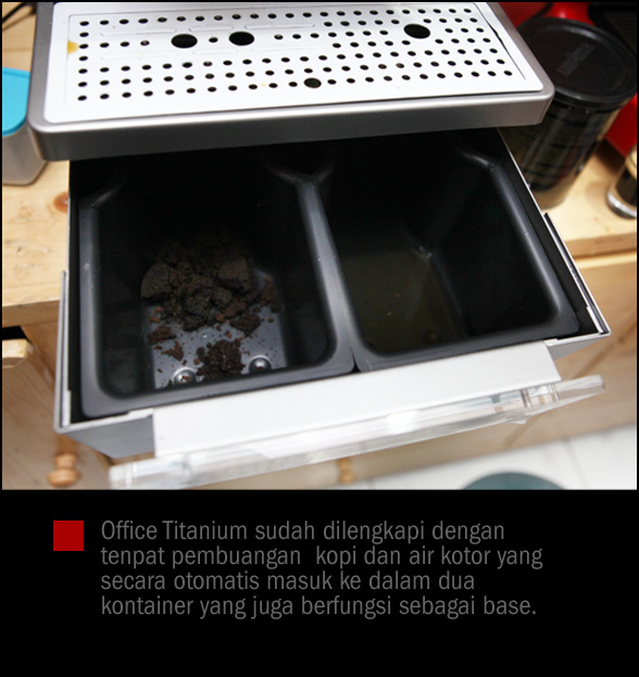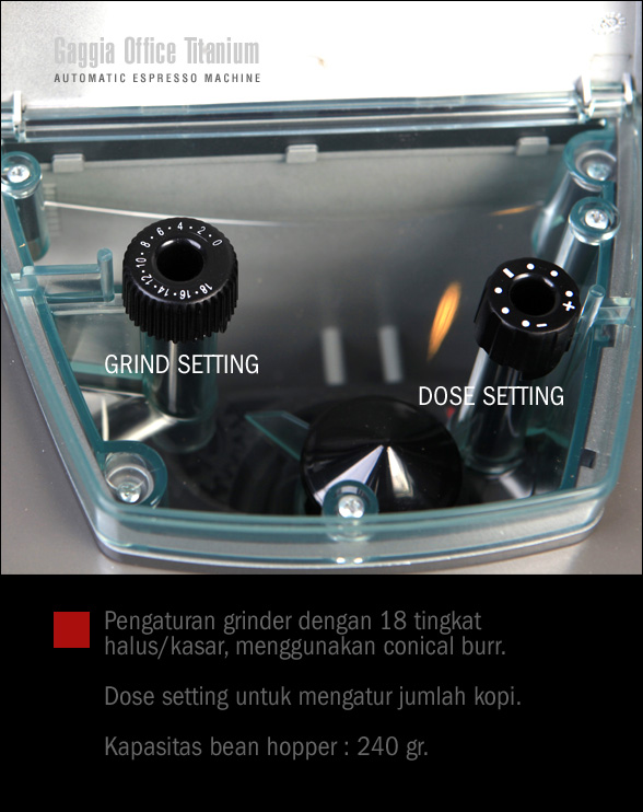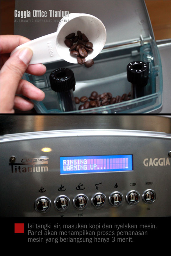 Mesin otomatis seringkali mempunyai kelemahan karena pengguna tidak bisa melakukan penyesuaian “grind”, tapi tidak untuk Titanium Office. Mesin ini dilengkapi dengan grind dan dose setting sehingga kita bisa memodifikasi rasa espresso dengan cara memainkan kedua fasilitas tersebut.  Untuk selanjutnya, foto2 di bawah akan memberikan gambaran bagaimana cara kerja mesin yang hanya butuh waktu pemanasan empat menit saja hingga siap digunakan.