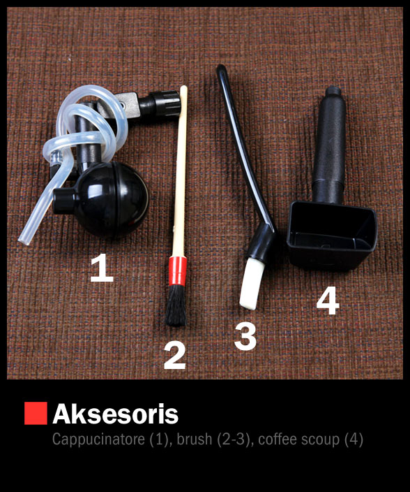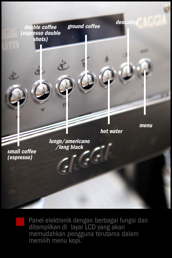 Dilengkapi dengan empat aksesoris, dua kuas pembersih, satu sendok kopi, dan yang paling menarik adalah cappucinatore atau frothing enhancement untuk menghasilkan froth yang lebih halus. Di panel LCD yang berwarna biru pada saat dinyalakan merupakan pusat dari segala aktivitas mesin ini. Terdapat 7 tombol yang masing2 berfungsi untuk : single shot, double, lungo, ground coffee, hot water, descaling, dan terakhir adalah pengaturan “menu”. Kesemuanya disajikan dengan “user friendly” sehingga akan memudahkan pengguna dalam pengaturan lebih lanjut.
