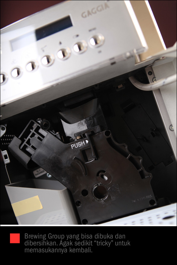 “brew” kopi siap tersaji tanpa harus “upacara khusus” ala barista di cafe.  Teknologi telah memudahkan cara penyajian kopi dengan pengaturan suhu yang pas, grind, dose, tekanan pompa dan boiler saat brewing, yang kesemuanya telah diatur dengan akurasi tinggi dalam sistem komputer yang ditanamkan pada mesin2 otomatis. Gaggia adalah salah satu pemain yang menyediakan mesin seperti ini buat konsumen yang menginginkan berbagai kemudahan  segelas kopi panas dengan hasil yang selalu konsisten. Gaggia Office Titanium di bawah ini.