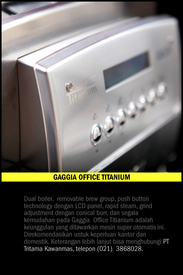 Kalau mesin komersial manual didesain untuk dioperasikan oleh barista yang terlatih, mesin super otomatis seperti Gaggia Office Titanium bisa digunakan siapa saja. Dengan satu sentuhan tombol