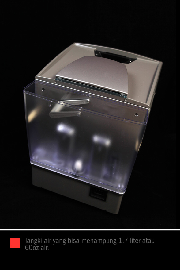 Tangki air cukup banyak menampung air, tapi harus secara teratur diperiksa agar mesin selalu mempunyai kecukupan suplai air. Satu hal, mesin secara pintar akan memberitahu saat waktu descaling harus segera dilakukan melalui panel elektronik di bagian depan. Descaling adalah proses membersihkan kerak yang terbentuk akibat penumpukan zat kalsium dan mineral lainnya yang mengeras di dalam boiler. Saya tidak melihat kit berupa “strip paper” untuk mengetest “water hardness” yang biasanya termasuk kelengkapan mesin otomatis. Terdapat empat bar dalam satu strip kertas dengan warna tertentu yang akan memberikan petunjuk tingkat “hardness”, dua warna yang keluar artinya air cukup “smooth”, empat warna adalah tingkat hardness tertinggi yang membuat descaling harus dilakukan lebih sering.