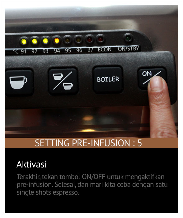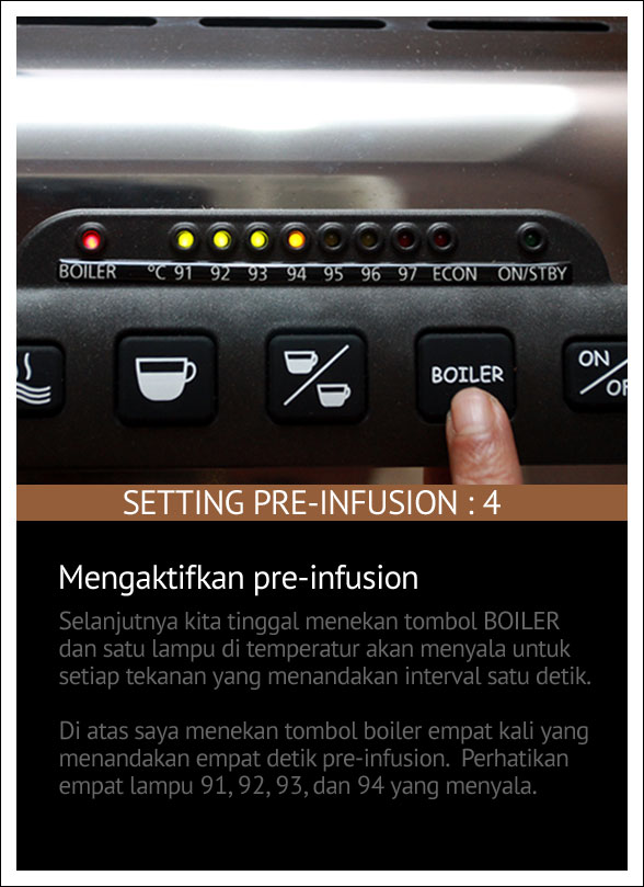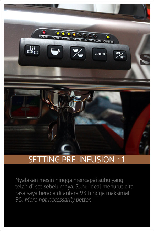 Menurut saya, interval 3 hingga 4 detik cukup ideal untuk meningkatkan intensitas krema dan rasa espresso yang lebih sweet pada after taste-nya. Preinfusion di atas waktu 5 hingga maksimal 8 detik akan meningkatkan keasaman dan puck yang sangat basah.