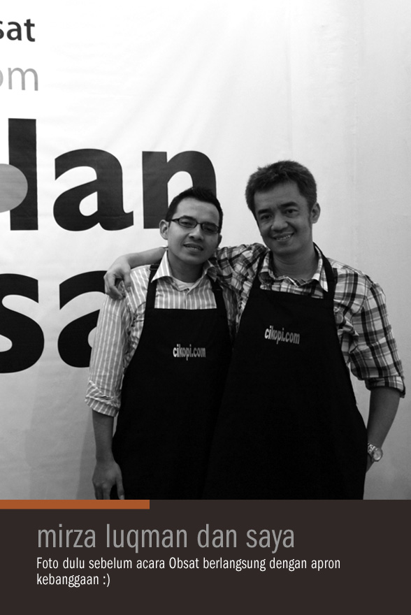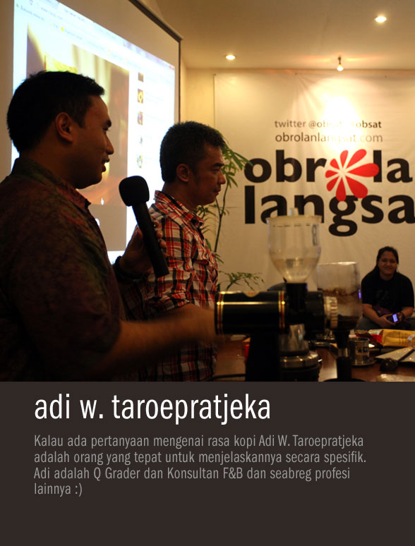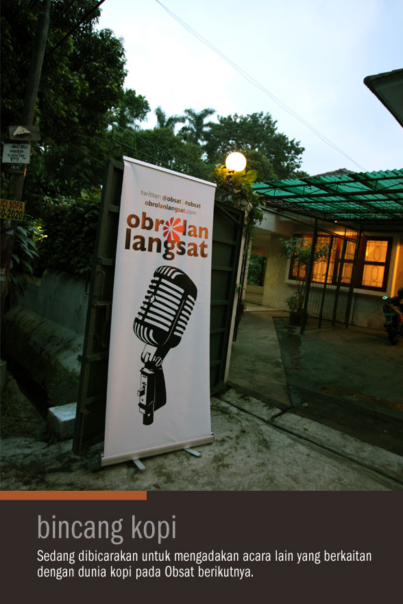 Kegiatan off-line seperti menjadi salah satu pembicara di Obrolan Langsat (Obsat) bersama Mirza Luqman dari Starbucks sebenarnya sudah direncanakan dan baru hari Rabu, 13 Oktober terlaksana. Dihadiri oleh cukup banyak peserta beserta rekan-rekan yang sudah tak asing di dunia kopi seperti Adi W. Taroepratjeka (Secangkir Kopi) yang hadir bersama istri Mia Laksmi Handayani, Hendri Kurniawan (Espresso1st), Agam Abgari (Anomali Coffee), Boy (Sebastian Coffee). Ini perbicangan santai tentang cerita dibalik “dunia hitam” yang ternyata banyak penggemarnya.