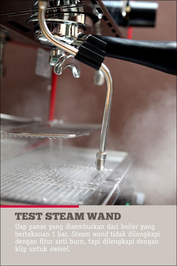 Steam wand terdiri dari empat lubang ukuran 1.2mm dan bisa digerakan dengan cukup bebas, namun tidak dilengkapi dengan fasilitas anti burn. Jangan khawatir, satu klip plastik berwarna hitam tertempel pada steam-nya untuk menghindari panas.