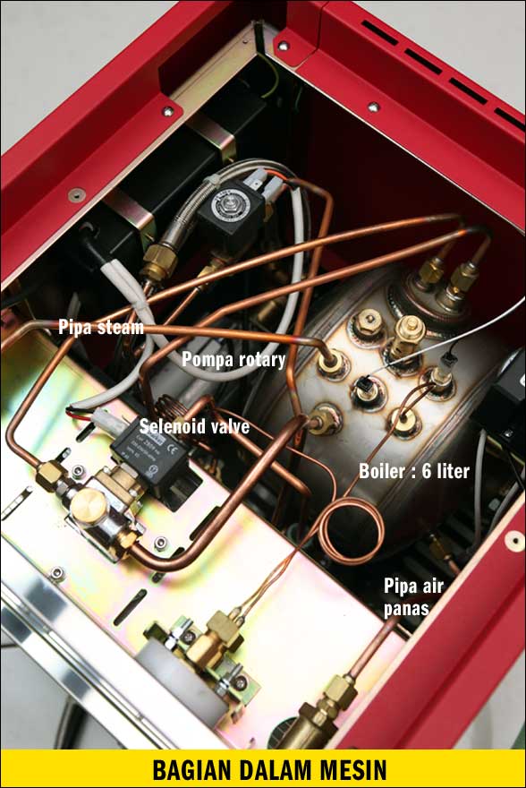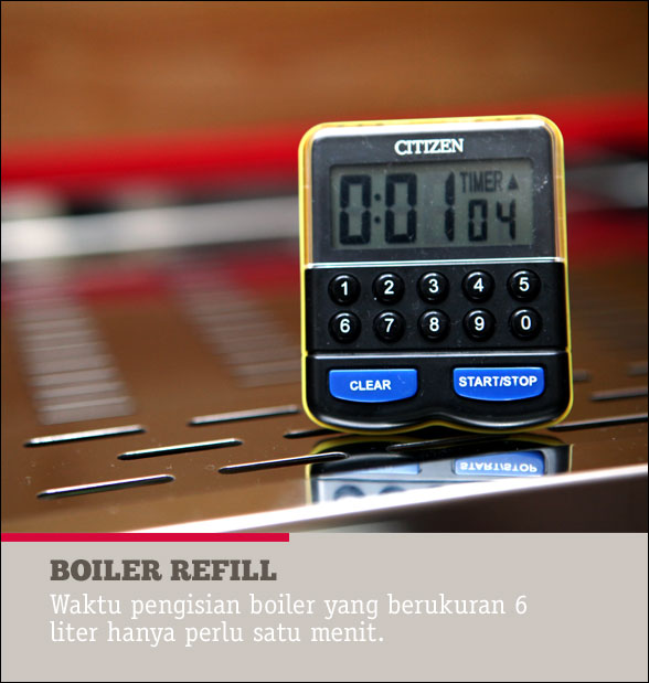 Saat mulai diputar satu langkah ke arah kiri, pompa rotary-nya mulai bekerja dan menyedot enam liter air dalam waktu hanya satu menit. Setelah selesai, putar lagi tombol dan tunggu sekitar 17 menit saat mesin siap untuk digunakan. Jadi total waktu yang diperlukan sekitar 18 menit dan sebagai perbandingan mesin komersial yang mempunyai 10 liter boiler biasanya memerlukan waktu 30 menit sebelum siap digunakan.