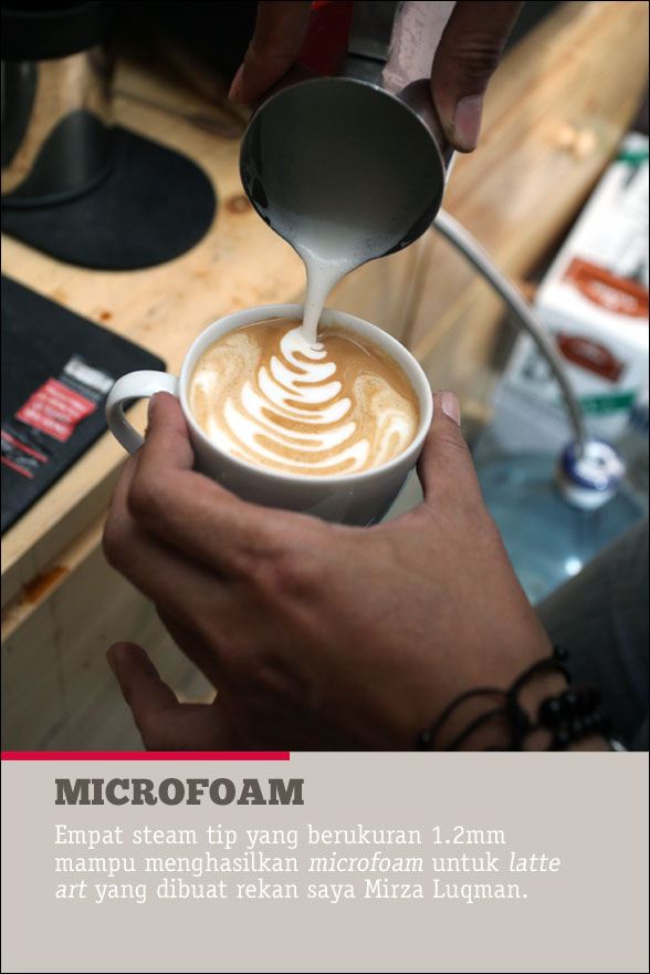 Di bagian steam wand, frothing milk dilakukan tanpa kesulitan dan bisa menghasilkan microfoam yang cukup bagus untuk membuat latte art seperti yang dilakukan oleh rekan Mirza.