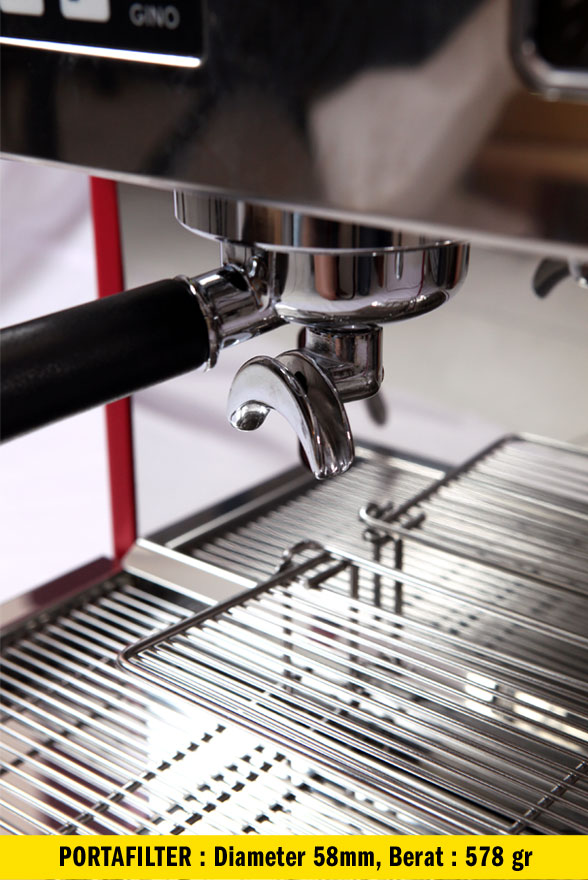 Mesin satu group ini menggunakan portafilter berukuran 58mm, standard yang banyak digunakan pada mesin2 espresso. Dilengkapi dengan satu manometer yang memberikan petunjuk tekanan boiler (1 Bar) dan pompa (9Bar). Terdapat indikator lain berupa penunjukan volume air pada boiler yang biasanya hanya terdapat pada mesin dua group.