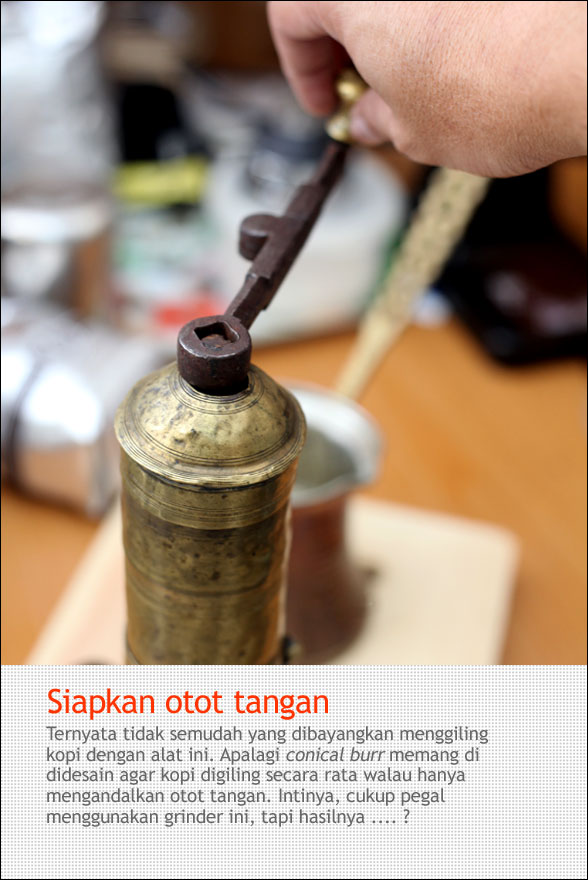 Sayangnya, walaupun menggunakan sistem conical, penggiling untuk kopi Turki ini tidak mempunyai motor dan hanya mengandalkan putaran tangan saja.  Walau demikian, jangan sangsikan kemampuannya dalam menghasilkan bubuk kopi yang begitu merata walau harus dibayar dengan pegalnya tangan Anda saat memutar tuasnya hingga lebih dari lima menit untuk 16 gram kopi.