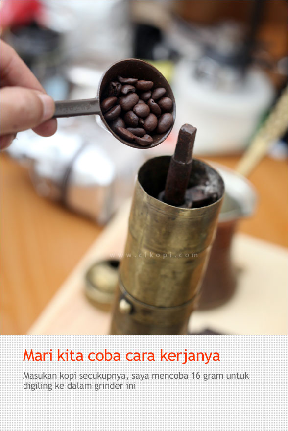 Karena setting-nya tidak dilengkapi indikator seperti angka, jadi saya memasukan dulu sedikit kopi lalu digiling untuk melihat hasilnya. Bila sudah cocok, tinggal masukan kopi secukupnya untuk kemudian melakukan olah raga tangan dengan memutar searah jarum jam.