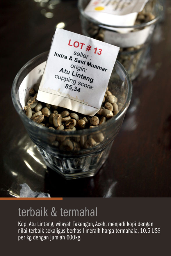 Pemilik kopi dari Atu Lintang tak kuasa menahan kegembiraannya saat kopinya memecahkan rekor sebagai kopi termahal di acara lelang kopi yang diselenggarakan oleh SCAI. Pembelinya Wendy de Jong, roaster perempuan yang bekerja untuk Tony’s Cafe di Seattle Amerika yang harus bersaing sengit dengan pembeli lainnya saat lelang berlangsung. Sejak awal kopi ini memang menjadi primadona dalam sesi penjurian dan meraih nilai tertinggi di antara kopi lainnya. Panitia lelang berhasil menjual lima ton kopi dan membukukan 225 juta rupiah yang dibeli oleh pihak dalam maupun luar negeri. Sebuah prestasi yang ditorehkan oleh SCAI dalam sebuah acara lelang kopi pertama di Indonesia yang acaranya dibuka oleh Wakil Menteri Pertanian, Bayu Krisnamurti di lokasi pabrik Kopi Bali, tanggal 10 Oktober kemarin.