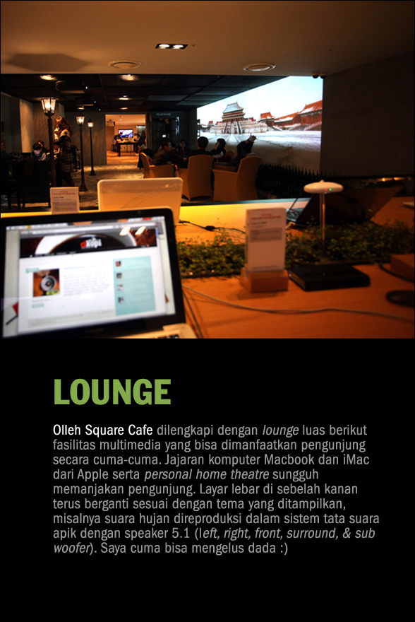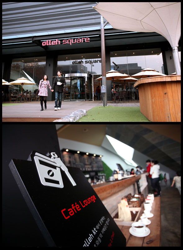 Kalau sebuah cafe dimiliki oleh sebuah perusaahaan raksasa seperti Korea Telecom, jadilah Olleh Cafe Lounge yang menempati gedung milik sendiri. Berlokasi di jantung kota Seoul tepatnya di kawasan Gwanghwamun, Olleh merupakan sebuah cafe high-end, dari sisi peralatan yang digunakan seperti mesin espresso Synesso Cyncra, kopi hasil blend sendiri yang bekerjasama dengan roaster terbesar di Korea, Tera Rosa, serta berbagai fasilitas multimedia untuk memanjakan pengunjung. Jangan khawatir bila komputer jinjing tertinggal, sebaris komputer dari Apple model terakhir bisa digunakan secara cuma2. Di ruangan terpisah terdapat ruangan menonton pribadi dengan layar LCD 42 inchi. Kurang apa lagi ?
