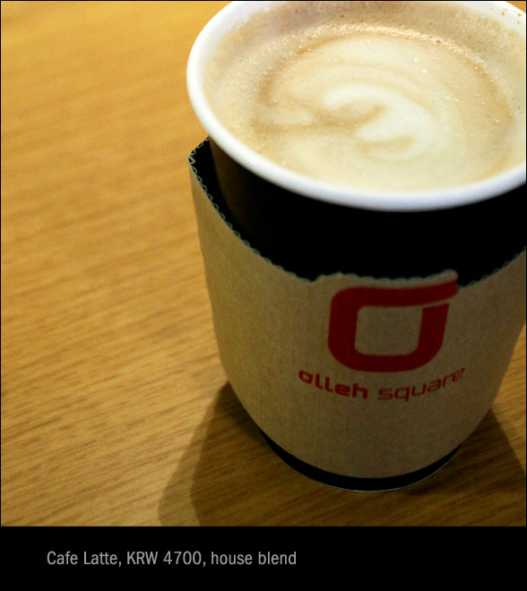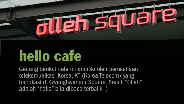 Gwanghwamun bisa diibaratkan seperti jalan Jed. Sudirman di Jakarta, kawasan perkantoran yang super sibuk. Di gedung yang entah berapa puluh tingkat inilah Olleh Cafe menempati ruangan lobi dan lounge terpisah yang berada di lantai atasnya.Olleh Square Cafe sangat memperhatikan penataan interior secara detail termasuk desain grafis dengan tipografi yang di desain secara khusus yang ditampilkan dalam setiap produk mereka. Walaupun terdapat tempat duduk di luar, pengunjung sama sekali tidak diperkenankan merokok.