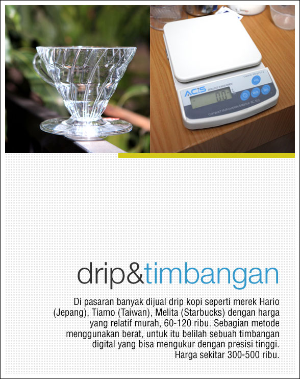 Selain alat penggiling kopi atau grinder, alat yang hampir selalu disebut disemua artikel di blog karena posisinya yang sangat fundamental, kita bisa membeli coffee drip di berbagai toko kopi. Terdapat berbagai macam merek, semuanya punya kelebihan dan kekurangan masing2 terutama dari segi kualitas bahan. Tapi sehari-hari saya tetap menggunakan merek Hario manakala ingin menyeduh kopi dengan metode ini. Sayang Hario yang berbahan keramik belum dijual di Indonesia, padahal selain lebih kokoh, material ini bisa menyimpan panas lebih lama dibanding dengan acrylic seperti model V60.