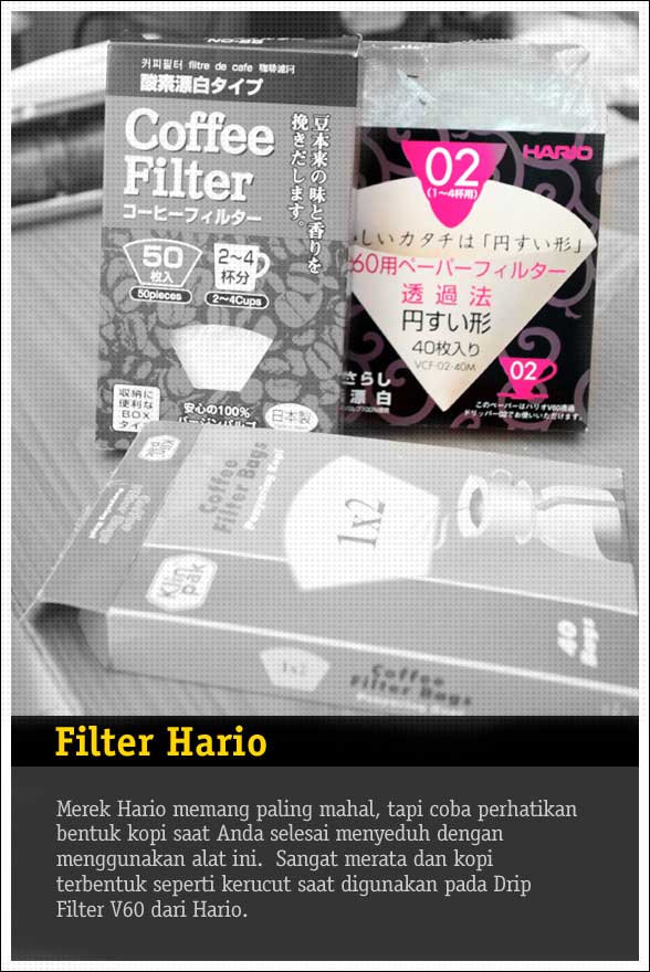 Sekarang saya pakai saringan dari semacam logam karena alasan rasa dan karena jauh beli saringan kertasnya kalau habis hehehe ;p