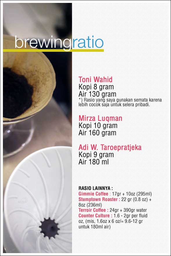 untuk light roasted bean, saya biasa pakai 14 gram untuk ±300 ml air. dan untuk membantu menghilangkan rasa kertas, saya membiarkan kertas di udara terbuka.. semakin lama semakin bagus. tentu tetap harus dibilas saat menyeduh.