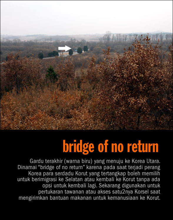 Bridge of No Return adalah julukan yang diberikan kepada sebuah jembatan kecil tempat pertukaran tawanan kedua belah pihak. Dulunya saat berakhirnya perang Korea, para tawanan perang Korut dipersilakan untuk memilih pihak Utara atau Selatan, sebuah opsi terakhir tanpa kemungkinan untuk kembali lagi. Selamanya. Bila anda memperhatikan film James Bond, dengan judul  “Die Another Day”, sutradaranya menggunakan jembatan ini dalam salah satu adegannya, tentu saja pengambilan gambarnya bukan di sini.