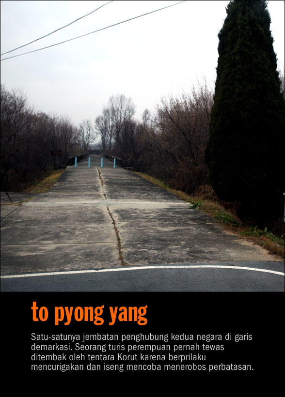 “Mohon Anda semua menandatangi surat pernyataan bahwa segala resiko termasuk kematian yang mungkin terjadi sepenuhnya ditanggung sendiri”. Demikian brifing di Camp Bonifas dari  seorang tentara Amerika Serikat terhadap seratusan orang yang mengikuti tur Demiliterized Zone (DMZ) termasuk saya. Kunjungan ke tempat ini sudah saya rencanakan jauh2 hari sebelumnya, cuma ingin melihat garis paralel 38 derajat yang memisahkan semenanjung Korea sejak perang saudara 1950-1953.  Setelah menginjakan kaki di lantai 104 World Trade Center di NY tahun 2000, kunjungan ke DMZ adalah pengalaman tak terlupakan sekaligus menegangkan. Ini sebagai selingan sebelum saya memuat artikel terakhir tentang cafe terfavorit selama kunjungan di Korea minggu kemarin.
