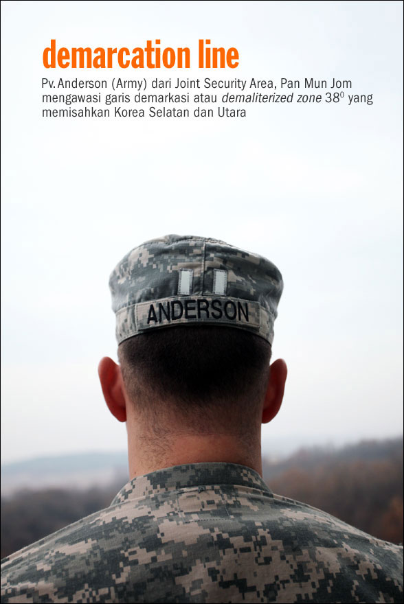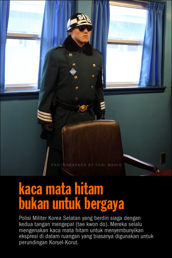 DMZ hanyalah sebuah garis demarkasi di Pan Mun Jom , satu jam dari kota Seoul yang membentang  di 38 derajat paralel yang memisahkan kedua Korea dengan lebar empat kilometer. Memasuki DMZ adalah melihat kewaspadaan tinggi tentara Korea dan Amerika dengan senjata yang siap ditembakan setiap saat. Mereka adalah prajurit pilihan yang selama 24 jam berada di garis depan musuh dalam jarak hanya puluhan meter saja. Bis yang saya tumpangi harus melewati banyak barikade dan pemeriksaan sebelum dizinkan keluar oleh tentara Amerika. Walau diperkenankan membawa kamera, tapi tidak sembarang bisa memotret di lokasi2 tertentu.