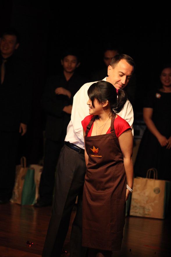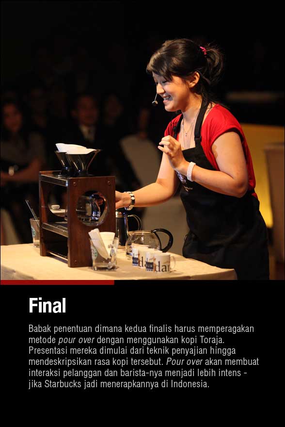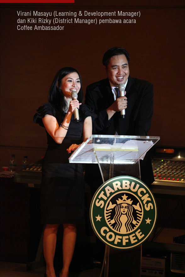 Ruangan di Jakarta Theatre yang dipenuhi oleh karyawan Starbucks rasanya tidak cukup menampung gemuruh peserta yang bertepuk riuh saat nama Novi Lianti (22 tahun) dinyatakan sebagai pemenang Coffee Ambassador untuk tahun 2010. Inilah hajatan besar Starbucks Indonesia, sebuah acara yang terangkum dalam sebuah kompetisi yang menegangkan tanpa menghilangkan unsur keceriaan karyawan mereka. Starbucks’ way ! Novi menyabet hadiah perjalanan ke perkebunan kopi di Thailand dan voucher, sekaligus berhak mengenakan apron coklat, sebuah standard tertinggi perusahaan ini yang menghargai karyawan yang mempunyai pengetahuan luas, bukan hanya tentang kopi, tapi juga tradisi Starbucks.