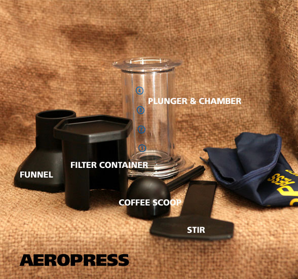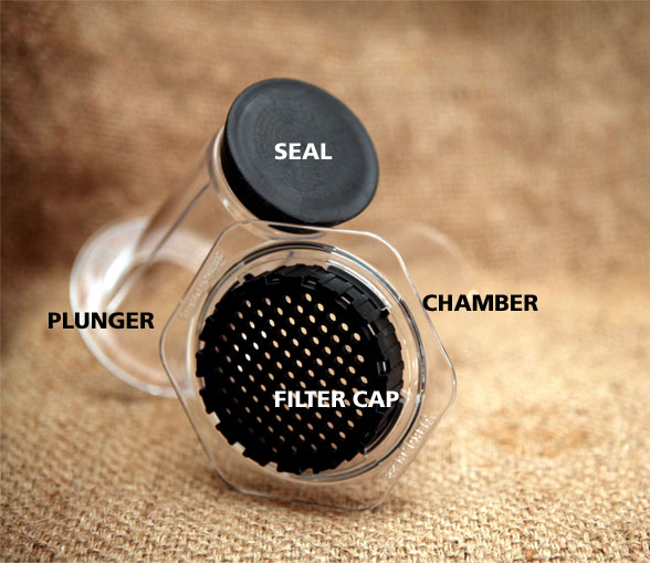 Di dalam box-nya terdapat dua bagian penting yaitu tabung yang terdiri dari chamber dan plunger. Chamber adalah tempat kita melakukan brewing dimana pada bagian dasarnya terdapat filter yang akan menyaring ampas kopi. Tabung yang satu lagi dinamai plunger karena berfungsi untuk menekan kopi melalui filter.