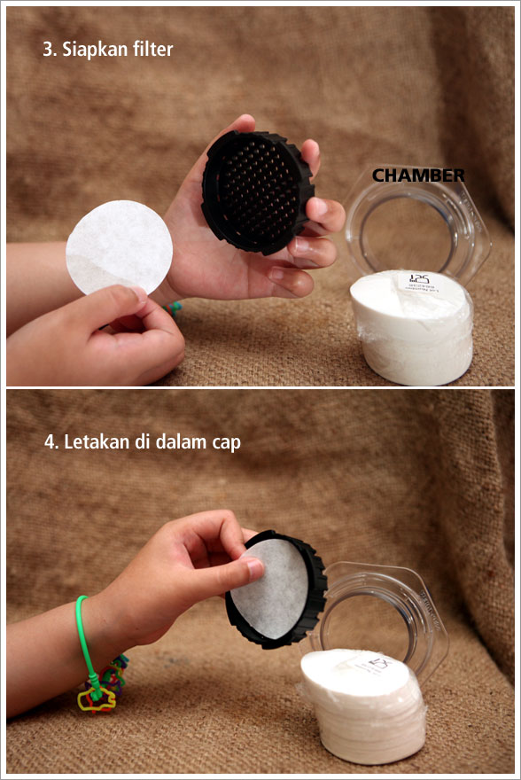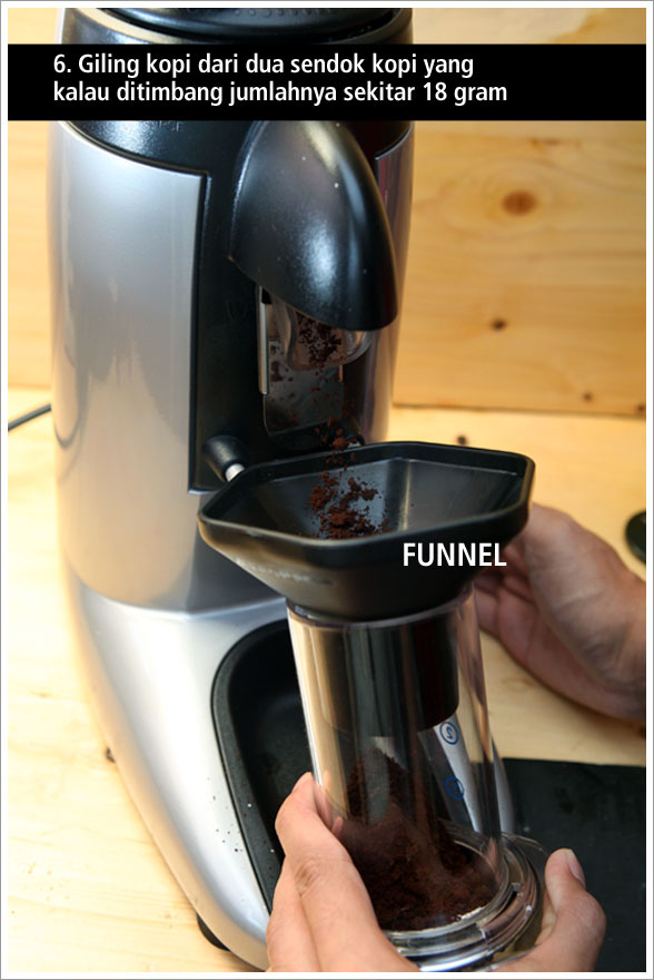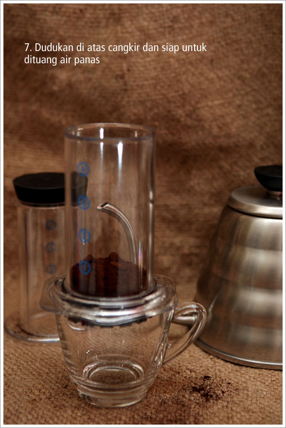 Tahap selanjutnya adalah memasukan kopi yang sudah digiling sebanyak satu sendok ke dalam chamber, lalu letakan di atas cangkir. Tuang air sesuai indikator angka, misalnya satu sendok untuk satu cangkir kopi. Atau agar lebih mudah Anda bisa menggunakan plunger sebagai gelas ukurnya. Saya sengaja melebihkan jumlah air sebanyak 1.5 gelas sekedar untuk mencoba bagaimana rasanya bila “menyimpang” dari instruksi yang diberikan.