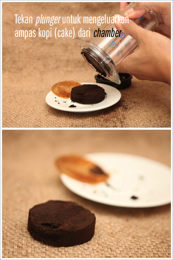 Setelah itu aduk perlahan hingga merata (kata Aeropress 10 detik) dan tekan perlahan dengan plunger. Cukup berat, apalagi kalau grind kopi terlalu halus (saya menggunakan grind lebih halus dibanding french press). Karena tekanan udara yang dihasilkan dari plunger cukup besar, cairan kopi akan turun sebelum alatnya menyentuh permukaannya.