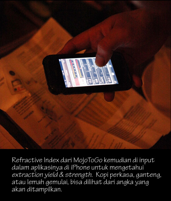 Untuk mencapai kordinat 18-22% v.s. 1.15-1.35% di sinilah peran MojoToGo sebagai sebuah GPS yang akan memandu penyeduh kopi agar menghasilkan kopi dengan flavor yang setidaknya bisa diterima oleh banyak orang. Begitu teorinya, dan malam tadi kami mencoba alat yang dibawa Arif Said dengan keingintahuan apakah kopi yang diminum sudah sesuai atau belum berdasarkan “petunjuk” dari SCAA.