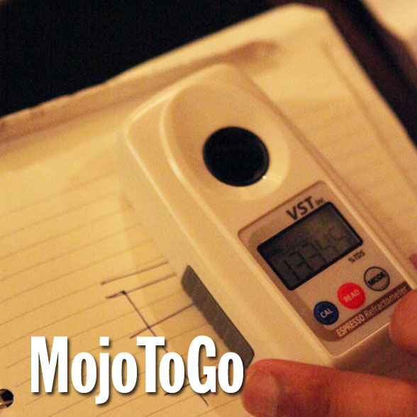 Menggunakan alat ini dimulai dengan mengambil sampel sebanyak 4-5 ml kopi melalui pipet, dinginkan sebentar dan letakan di celah hitam (refractometer well) pada alat MojoToGo. Biarkan hingga setengah menit lalu tekan tombol “Read”, dan MojoToGo akan menampilkan sebaris angka yang terdiri dari lima digit yang merupakan refractive index berikut temperaturnya. Angka refractive index an suhu dari sampel kopi yang dihasilkan dari MojoToGo ini kemudian dimasukan ke dalam aplikasinya yang bisa dibaca dalam iPhone untuk mengetahui extraction yield dan strength (TDS).