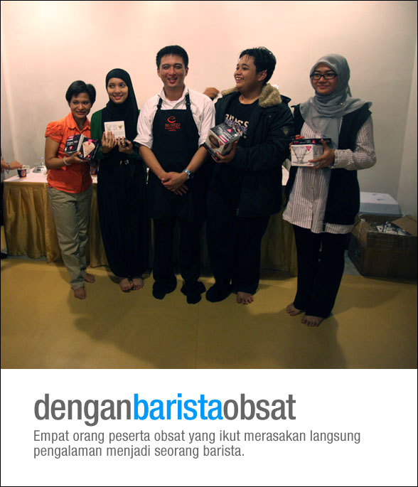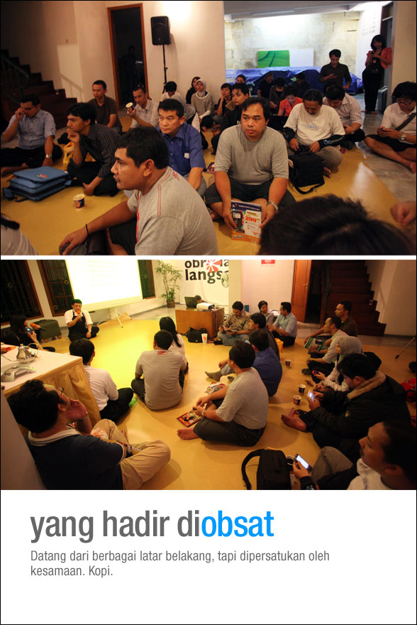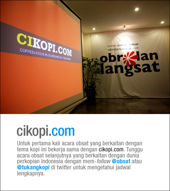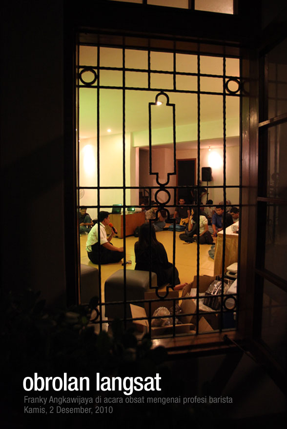 Rasanya rugi kalau Anda tidak sempat hadir dalam acara Obrolan Langsat atau Obsat, tanggal 2 Desember kemarin yang menampilkan guru barista Indonesia, Franky Angkawijaya. Dengan moderator Vera Makki, juga seorang penggila kopi, Franky berbagi passion-nya dalam dunia barista dengan sekolah Esperto Barista School yang dipimpinnya. Ini acara obsat kedua yang bertema kopi setelah sebelumnya saya dan Mirza menjadi pembicara dalam Bincang Kopi tanggal 13 Oktober yang lalu.