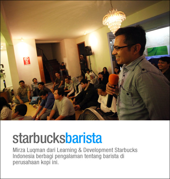 Tidak ketinggalan Mirza Luqman dari Learning & Development Starbucks Indonesia berbagi pengalamannya dalam melatih para barista di perusahaan kopi Amerika ini. Ia mengamini pendapat Franky, bahwa passion terhadap dunia kopi adalah kata kunci untuk menjadi seorang barista yang baik.