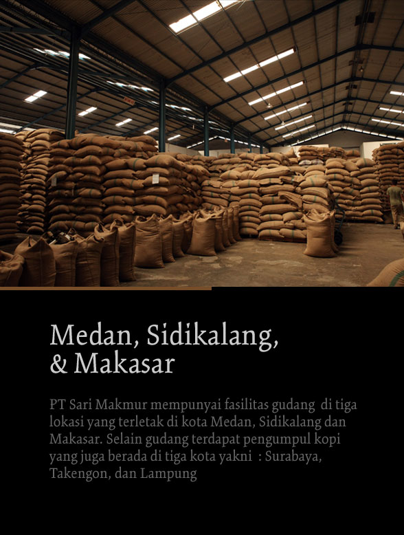 Memasuki pabrik PT Sari Makmur yang luasnya lebih dari 4 hektar, saya diperlihatkan dengan fasilitas gudangnya yang maha besar itu. Entah dari mana saja kopi mereka berasal, tapi sejauh mata memandang hanya terlihat tumpukan karung bji kopi dalam sebuah ruangan yang luasnya mungkin melebihi lapangan sepak bola. Di tempat yang sama lima orang pekerja sedang memasukan biji kopi dari mesin raksasa yang bersuara gemuruh.