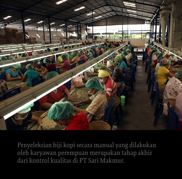 Lalu saya diajak ke tempat penyortiran yang dilengkapi dengan fasilitas modern dimana mesin yang melakukan penyeleksian sebanyak tiga tahap. Demi meningkatkan kualitas, seratusan orang karyawan melakukan sortir terakhir secara manual alias dengan mengandalkan penglihatan. Tangan2 terampil pekerja perempuan begitu cepat memilah kopi yang berkualitas dengan biji yang di bawah standard. Proses ini untuk memastikan kualitas kopi yang konsisten untuk semua pelanggan Sari Makmur.