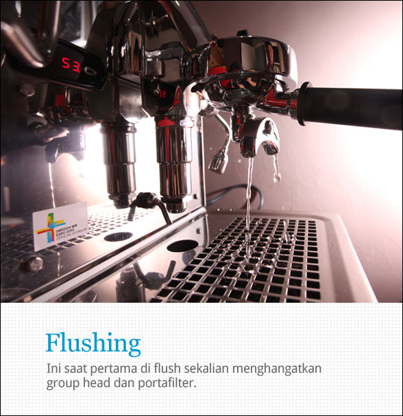Setiap mesin pasti selalu di test di pabrikan dan menyisakan air yang entah berapa lama tersimpan di dalam boiler hingga sampai di tangan konsumen. Jadi saya selalu membiasakan untuk flushing sebanyak mungkin dan terus menambahkan air ke dalam tangki air hingga yakin tidak ada perubahaan warna apapun. Hal ini dilakukan sekaligus untuk membersihakan dan memanaskan group head berikut portafilter-nya.