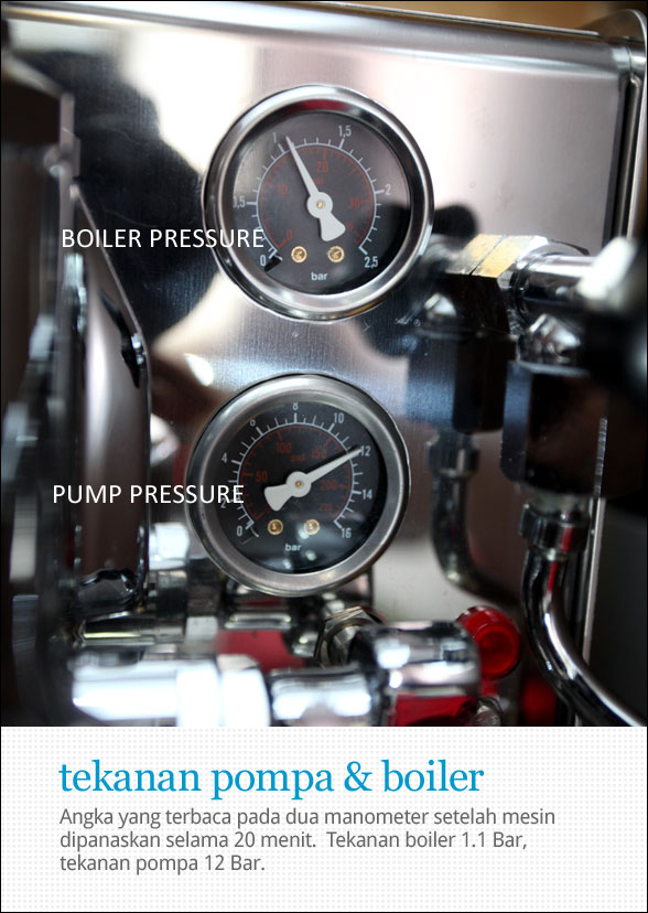 Suhu menunjukan angka 30 derajat celsius saat mesin pertama dinyalakan, lalu perlahan mulai naik cukup cepat. Di 10 menit pertama suhu sudah mencapai 60 derajat, 10 menit berikutnya sekitar 80, lalu stabil pada suhu 94 derajat dengan total waktu 25 menit, mesin siap digunakan. Pada manometer saya mencatat kalau tekanan boiler di set pada 1.1 bar, dan pompa di angka yang cukup tinggi yakni 12 bar. Mungkin karena menggunakan pompa vibrasi sehingga mesin ini memerlukan tekanan pompa yang lebih tinggi dari 9 bar. kasus yang sama juga saya temukan pada Vibiemme Domobar pada versi pompa vibrate saat tekanannya tercatat di angka 12.