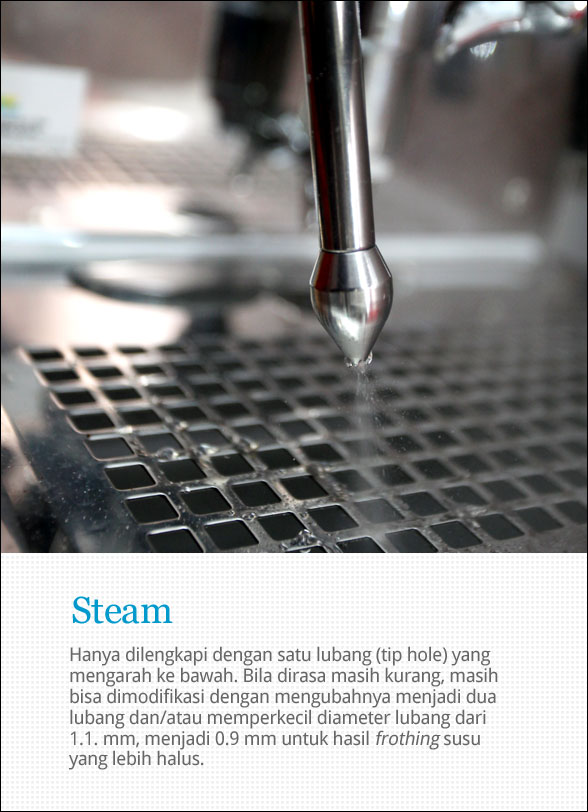 Saya ingin meluruskan untuk poin “Steaming/Milk Froathing”.Kalau kita ingin membandingkan “lama/waktu froathing” setiap merk mesin, harus melihat data teknis dari tiap mesin.Satu hal yg harus di perhatikan oleh para pengguna mesin: Kekuatan steam dan ketahananya sangat tergantung dari VOLUME BOILER mesin yang dimaksud.