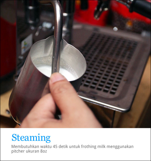 Dengan satu lubang saya mencatat untuk jug 8 oz diperlukan waktu minimal 45 detik untuk membentuk microfoam. Expobar memang memerlukan waktu yang agak lama dibanding dengan Giotto dan Vibiemme yang dua lubang serta La Spaziale yang punya empat lubang dan lebih “galak” saat melakukan milk frothing. Namun menurut Adi dan Mirza, steam dengan Leva sangat sesuai untuk pemula karena lebih mudah dan jarang gagal.