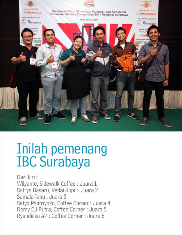 Mari kita memberikan ucapan selamat kepada enam finalis IBC Surabaya yang meraih tiket ke grand final di Jakarta bulan April mendatang. Wilyanto dari Sidewalk Coffee kota Kediri berhak menyandang juara pertama dan menyisihkan 25 peserta yang datang dari berbagai kota di Jawa Timur. Sebagai pemenang, Wili meraih hadiah utama berupa voucher sebesar 5 juta rupiah dari Toffin Product. Kegiatan IBC wilayah Surabaya baru saja diselenggarakan pada tanggal 28-30 Januari di hotel Singgasana, Jl. Gunung Sari Surabaya.