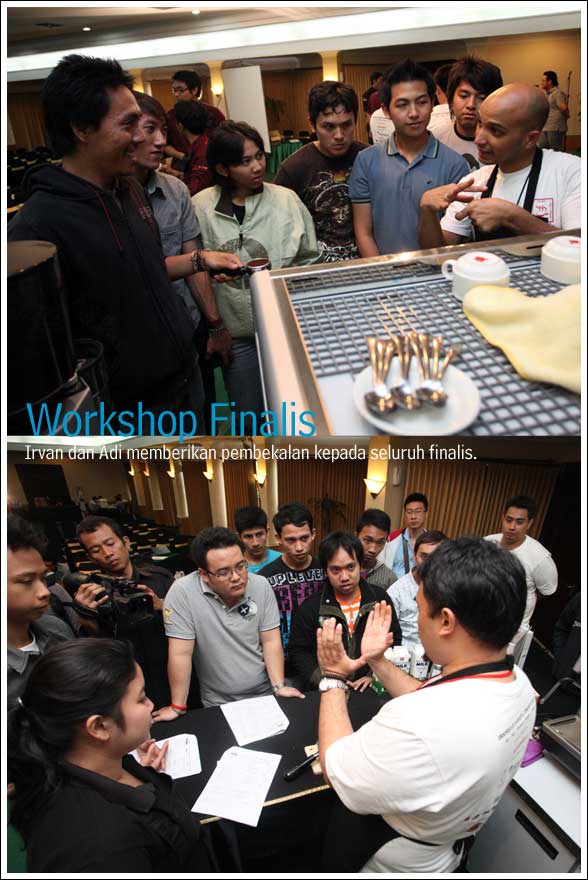 Workshop dimaksudkan agar peserta lebih mendalami esensi lomba dari sisi teknis dan pendalaman dari pengetahuan yang telah mereka peroleh selama ini. Pada sesi workshop di hari kedua, Surip Mawardi, peneliti senior dari Indonesian Coffee and Cocoa Research Institute Jember membekali peserta dengan pengetahuan mengenai kopi dari proses tanam hingga penyajian. Surip menekankan sifat biji kopi yang menyerap bau2an hingga sangat rentan dengan aroma sekitar. Diperlukan ketelatenan dari mulai pemilihan varietas, perawatan tanaman, pengolahan, roasting, hingga penyajian yang salah satunya merupakan tugas dari para Barista.