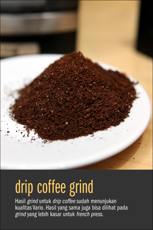 Siapkan kopi dan sambungkan ke listrik dan lampu led mulai berkedip, Vario siap digunakan baik cara manual maupun otomatis. Untk yang manual tinggal pilih setting baik untuk french press (paling bawah) drip (tengah) dan espresso (paling atas). Setelah siap, tekan tombol “start” dan kopi pun digiling oleh Vario dengan suara yang sangat halus karena produk ini menggunakan sistem timing belt. Dua puluh gram biji kopi digiling kurang lebih 18 detik, itu hasil sementara yang saya dapatkan dari grinder sekecil ini.