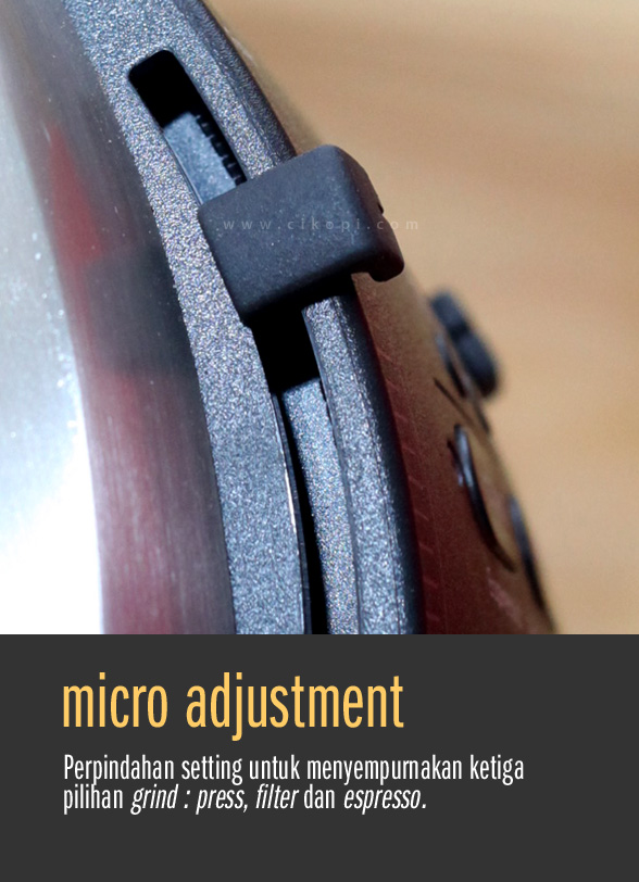 Sebagaimana disebutkan di atas, terdapat tiga grind setting yang terdapat pada macro adjustment-nya : Press, Filter, dan Espresso. Ketiga pilihan ini masih bisa di sesuaikan setting-nya dengan manik-turunkan tuas micro adjustment di bagian sebelah kiri. Malkonig tampaknya mengakomodasi kebutuhan barista dengan ratusan setting dengan cara mengkombinasikan micro dan macro adjustment.