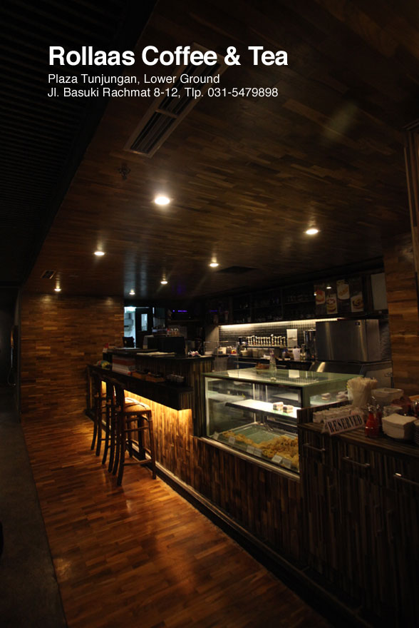 Kedai kopi mereka yang kami kunjungi bersama rekan2 panitia Indonesia Barista Competition (IBC) berlokasi di Tunjungan Plaza yang merupakan salah satu mall yang paling ramai dikunjungi masyarakat Surabaya apalagi di akhir pekan kemarin. Dengan luas sekitar 80 meter persegi, Rollaas di desain dengan memadukan unsur interior modern dengan penggunaan furniture kayu yang dimaksudkan untuk menghangatkan suasana. Di salah satu dinding terdapat tumpukan kayu kopi hingga ke plafon yang ditata sedemikian rupa sebagai elemen interiior yang terintegrasi secara cantik.