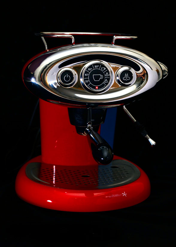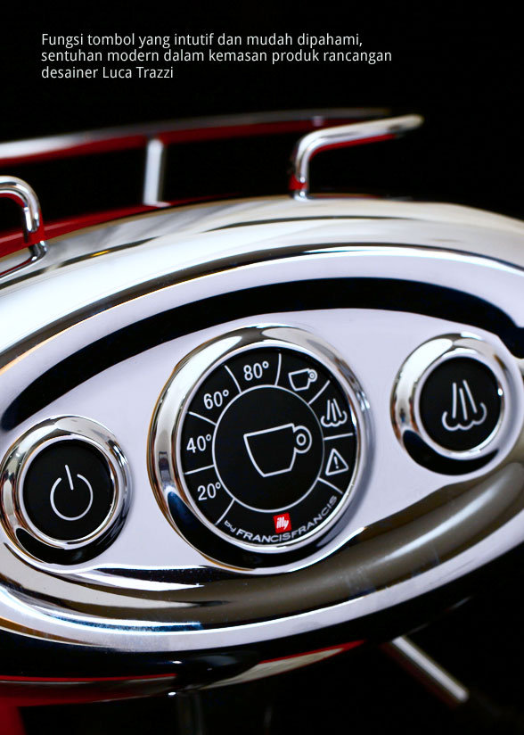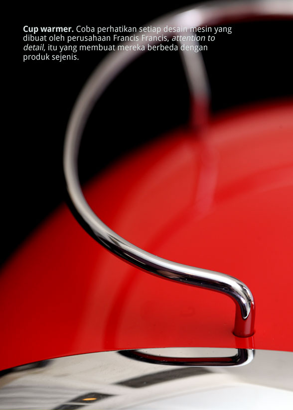 Francis Francis adalah anak perusahaan Illy yang berdiri sejak tahun 1994, terkenal dengan desain yang memadukan unsur modern dan estetika retro dalam setiap produknya, pokoknya selalu elok untuk dipandang. Mesin yang Anda lihat adalah Francis Francis X7 iperEspresso, yang khusus menggunakan sistem kapsul, mari kita jelajahi bentuk fisiknya. Dibuat dalam tiga warna, yakni merah, putih, dan biru dengan berat hanya 5 kilogram. Cup warmer menggunakan “pagar” stainles yang bisa di buka bila tidak digunakan.