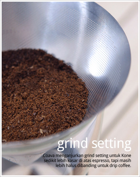 Coava menganjurkan untuk memilih grind setting yang sedikit lebih kasar dari espresso, tapi sedikit halus dibandingkan untuk drip coffee pada Hario V60.
