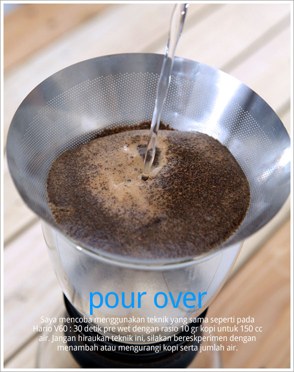 Langkah yang saya lakukan tidak jauh berbeda dengan metode pour over pada alat Hario V60. Kalau mau sedikit repot Anda bisa menggunakan timbangan digital, tapi kalau mau lebih praktis gunakan saja rasio kopi dan air , misalnya 10 gram kopi untuk 150-170 ml sesuai dengan selera, toh Anda sendiri yang tahu takaran paling pas.