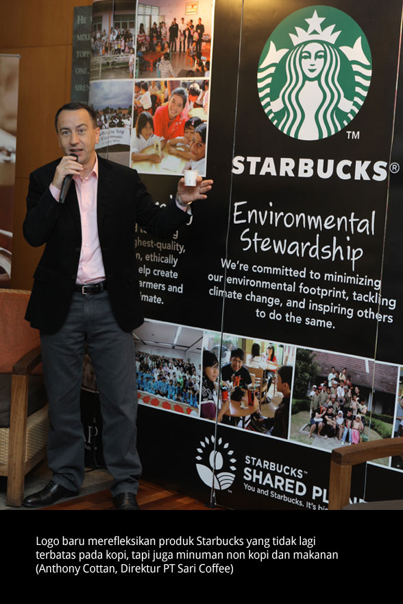 Starbucks baru saja meluncurkan logo barunya dalam sebuah jumpa pers yang bertempat di Mall Grand Indonesia, Jakarta pada 8 Maret. Identitas barunya memangkas lingkaran yang bertuliskan “Starbucks Coffee” dan membuat Siren, si putri duyung berekor kembar “terbebas” dari lingkaran tulisan “Starbucks Coffee”. Menurut Anthony Cottan, Direktur Sari Coffee, dalam sambutannya mengatakan bahwa logo baru tidak lagi membatasi sebagai perusahaan penyedia kopi, tapi juga inovasi dalam produk non-kopi berikut makanan. Bersamaan dengan logo baru, Starbucks juga meluncurkan minuman terbaru yang antara lain Cocoa Cappuccino dan blend terbaru Strabucks Tribute Blend racikan yang terdiri dari biji kopi Papua Nugini, Colombia, Ethiopia dan aged Sumatra.