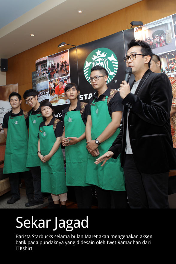 Ada satu yang menarik pada acara peluncuran logo baru Starbucks : “Barista in Batik” sebuah seragam baru dengan aksen motif batik di pundak mereka yang akan dikenakan selama bulan Maret ini. Motif batik didesain oleh Iwet Ramadhan dari TIKshirt yang diberi nama Sekar Jagad. Motifnya berupa kesatuan flora, fauna, yang mencerminkan lokalitas budaya Indonesia dalam sebuah nilai perusahaan multinasional.
