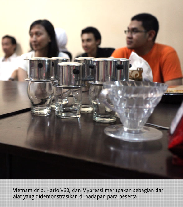 Rasanya kurang komplit bila trend menyeduh kopi seperti drip atau pour over tidak diperkenalkan kepada undangan yang hadir. Nah ini bagian saya yang secara singkat menjelaskan ritual pour over dengan menggunakan filter Hario V60 dengan cara diukur menggunakan timbangan digital dengan rasio 10 gr kopi untuk 150 gram air dan suhu sekitar 94 derajat celcius. “Oooo ternyata begini ya cara menyeduh kopi. Wah repot juga ya, tapi sumpah baru kali ini saya tahu ada metode seduh sampe segininya” dan masih banyak komentar lain yang bermunculan selama peragaan cara seduh dengan filter Hario. Lalu pihak kopi Bel Canto yang sudah dua kali berpatisipasi dalam acara Obsat menjelaskan tentang alat Vietnam Drip berikut peragaan cara meneyduhnya dengan atau tanpa susu.